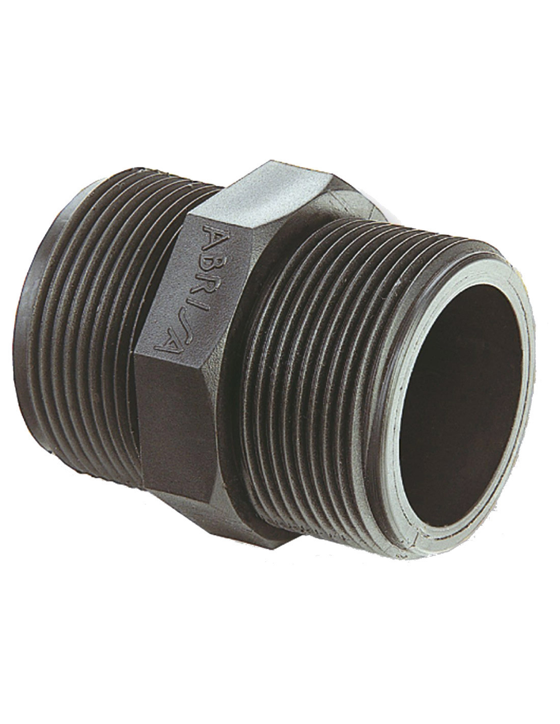 - Manguito de reducción macho - macho fileteado de PEHD (polietileno de alta densidad) de la marca ABRISA, utilizado comúnmente en sistemas de riego.